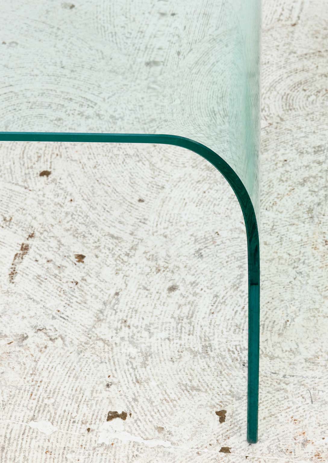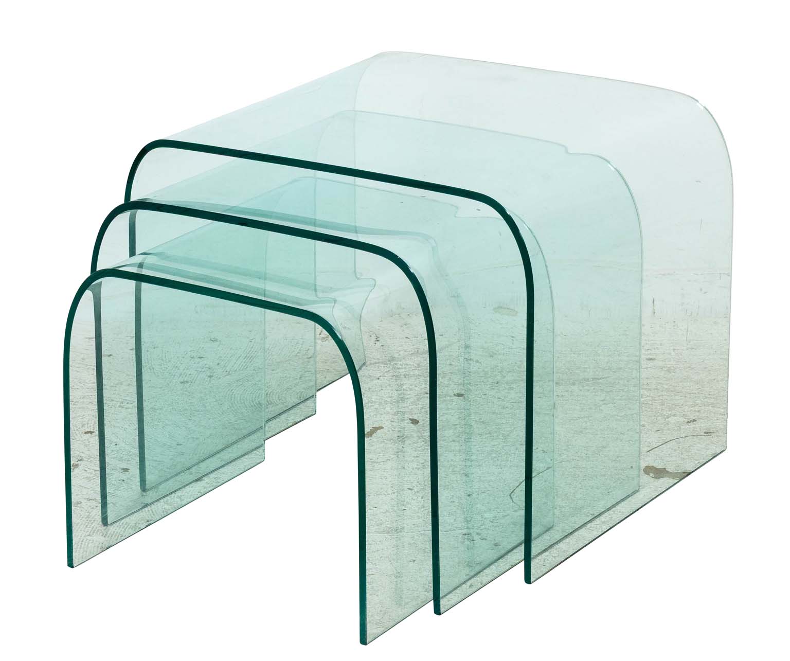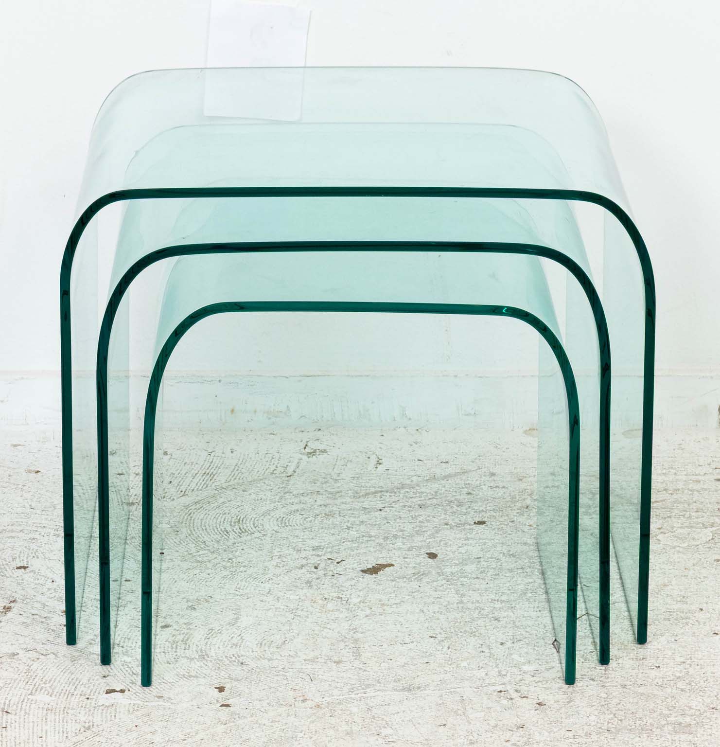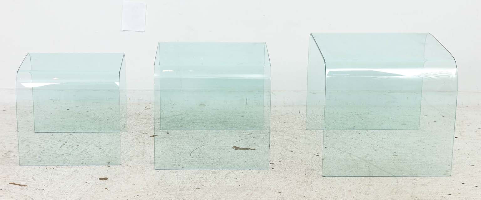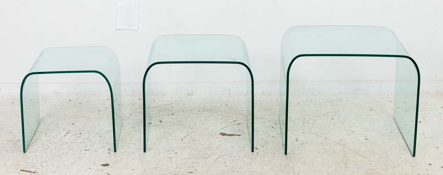 A sculptural trio of bent glass nesting tables attributed to Pace Collection, circa 1970s, United States. Each table is expertly formed from a single sheet of thick, curved glass, producing a seamless waterfall silhouette that epitomizes mid-century modern minimalism. The clear aquamarine tint and polished edges reflect the refined craftsmanship for which Pace was known, offering an airy presence that complements both contemporary and vintage interiors.